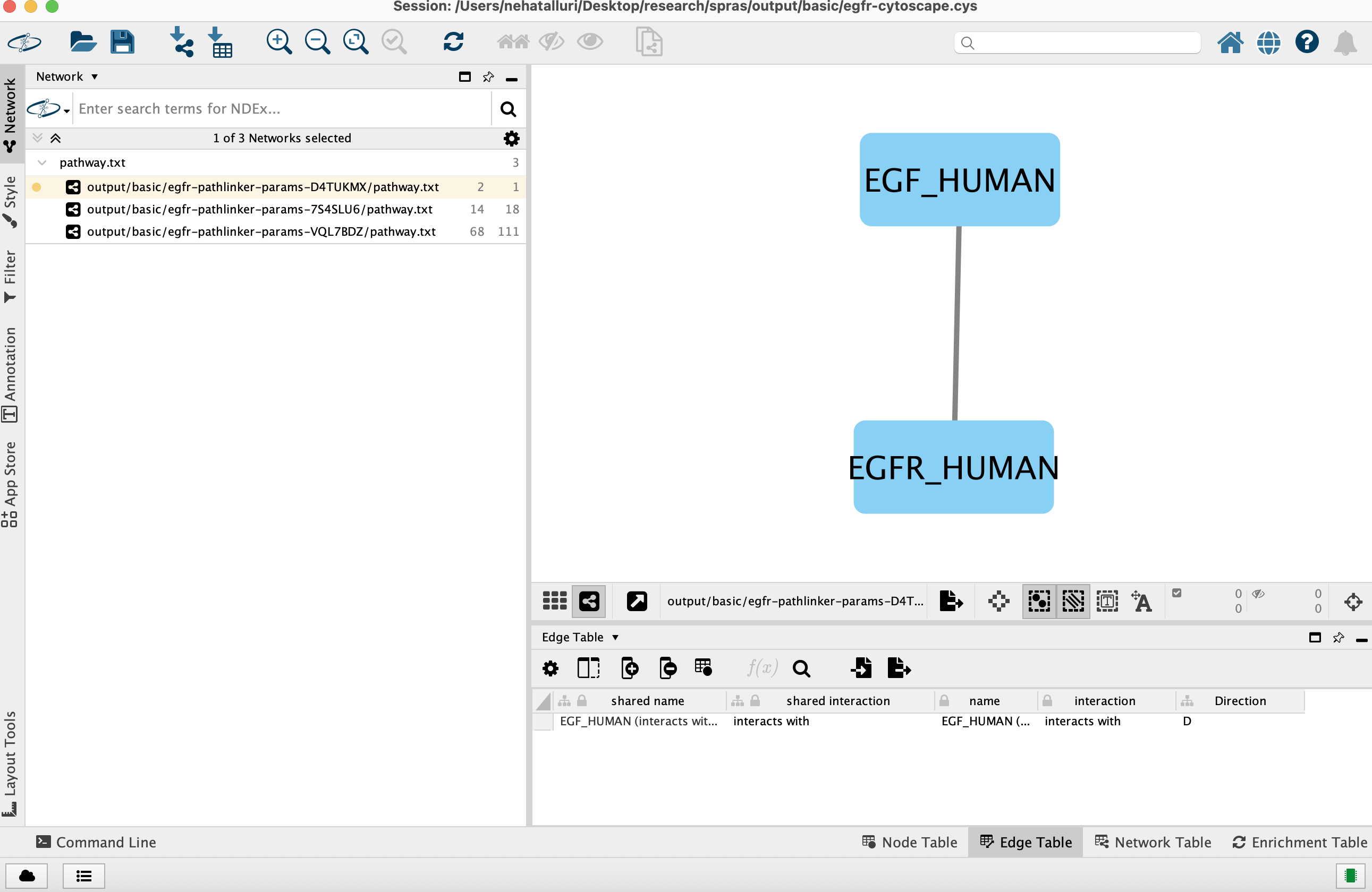 A Cytoscape session file is then generated, containing visualizations for each pathway and saved as egfr-cytoscape.cys.